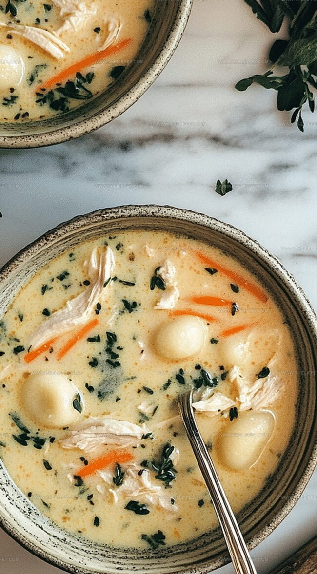 Soft potato dumplings dance alongside tender chicken pieces in a creamy broth.