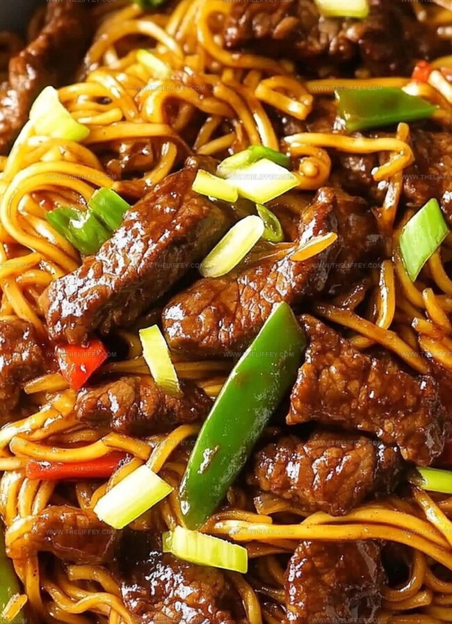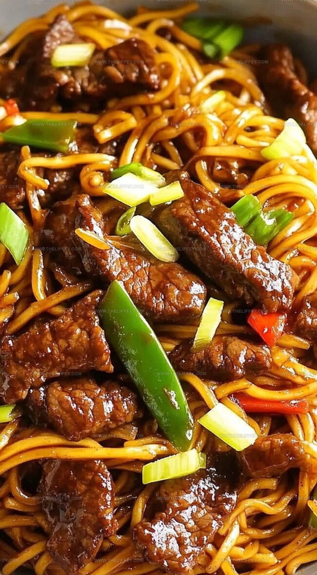 Tender strips of beef nestle among glossy noodles, each bite promising a perfect balance of savory and sweet.