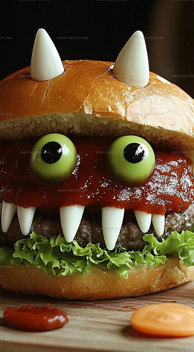 - Insert black olive “eyes” using toothpicks, positioning them dramatically atop the burger for maximum monster character.
