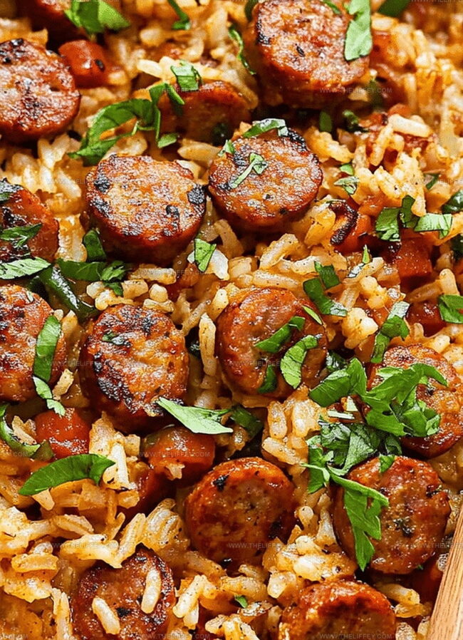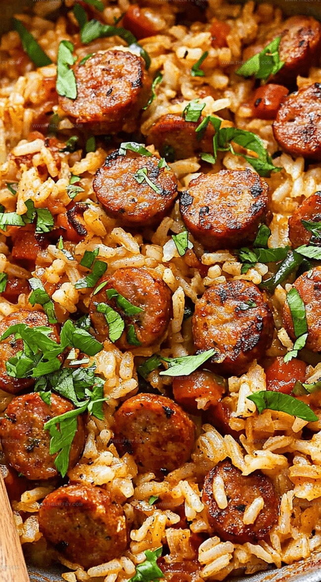 Spicy andouille sausage sizzles alongside tender rice, creating a one-pan meal packed with zesty character.