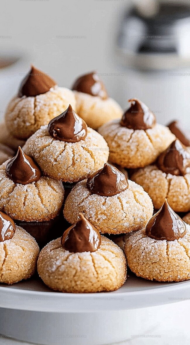 - Gently press chocolate kiss into warm cookie center to create a smooth, glossy chocolate topping without cracking the delicate cookie base.