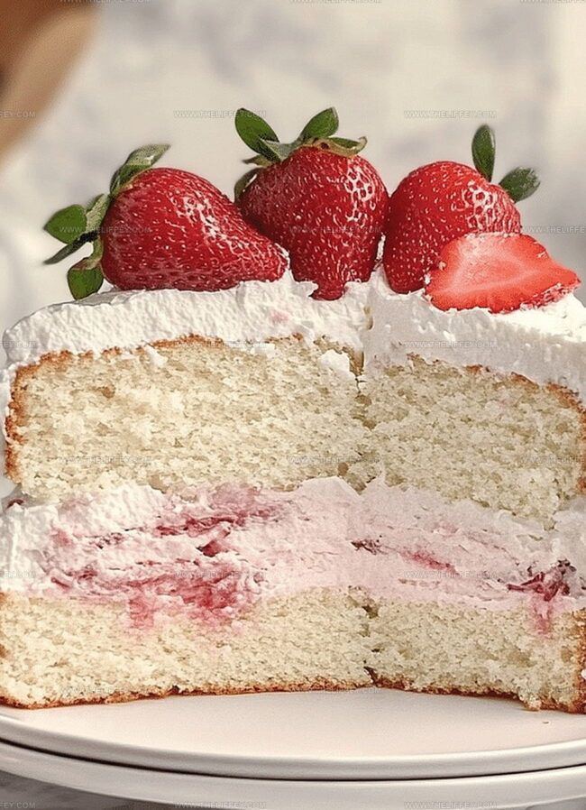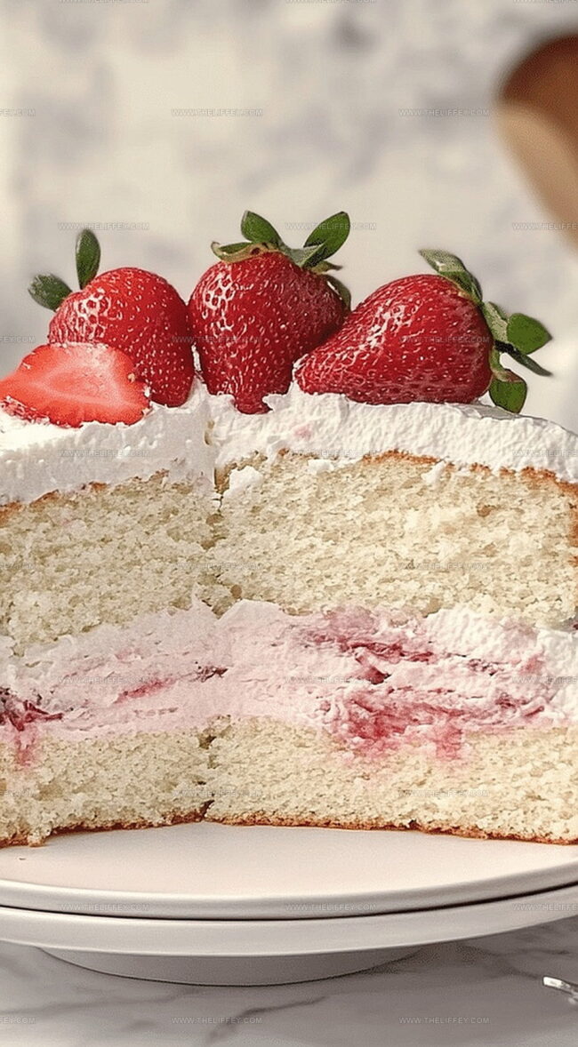 Delicate crumbs melt softly, revealing vibrant strawberry ribbons tucked between luxurious cake layers.