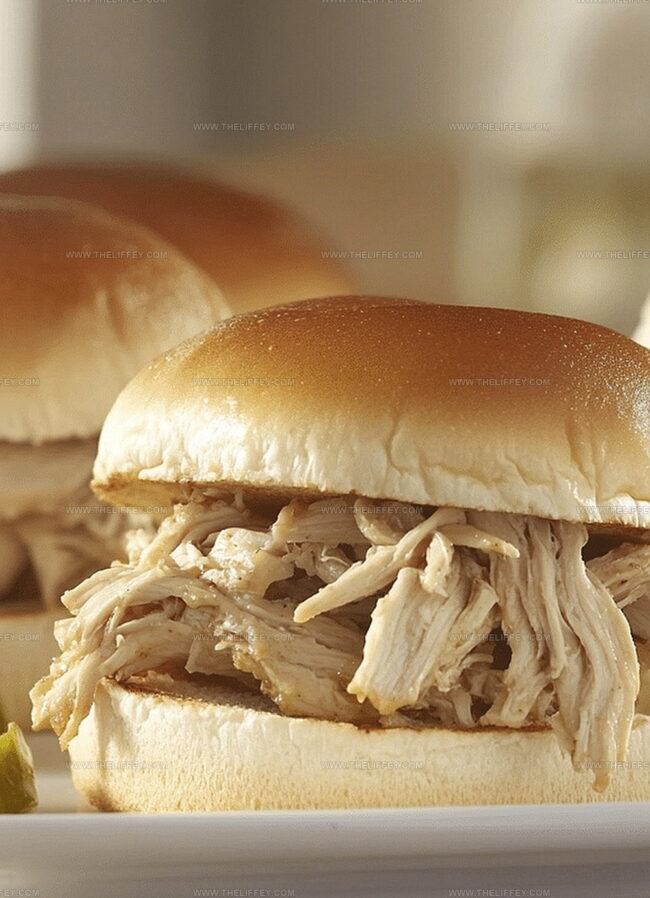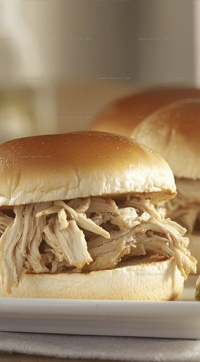Tender shredded chicken nestles between soft rolls, promising a mouthwatering experience.