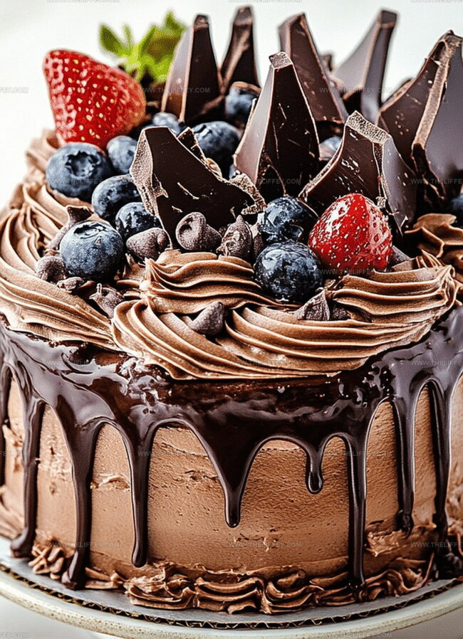 This cake combines cocoa powder, chocolate chips, buttermilk, and a rich ganache to create an intensely chocolatey dessert with multiple layers of chocolate flavor.