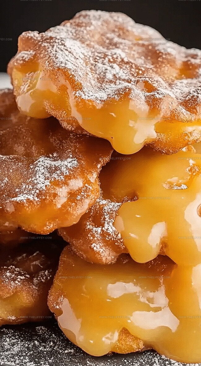 Powdered sugar dusts these fritters like delicate winter snow, adding a playful touch of sweetness.