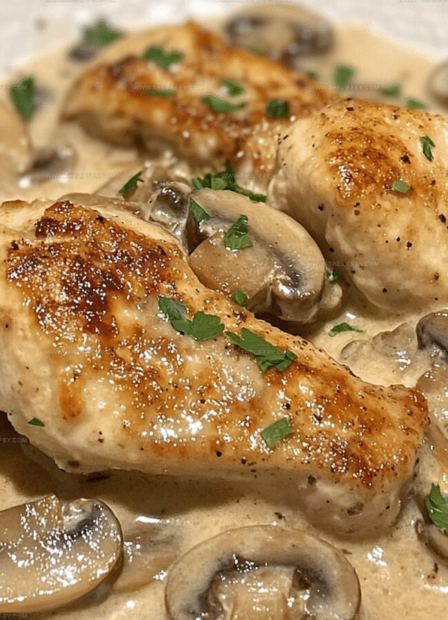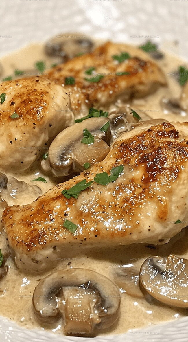Tender chicken breasts nestle beneath a silky sauce packed with earthy mushroom goodness.
