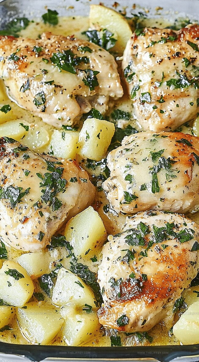 Tender chicken pieces nestle alongside perfectly roasted potato chunks, promising a delightful dinner experience.