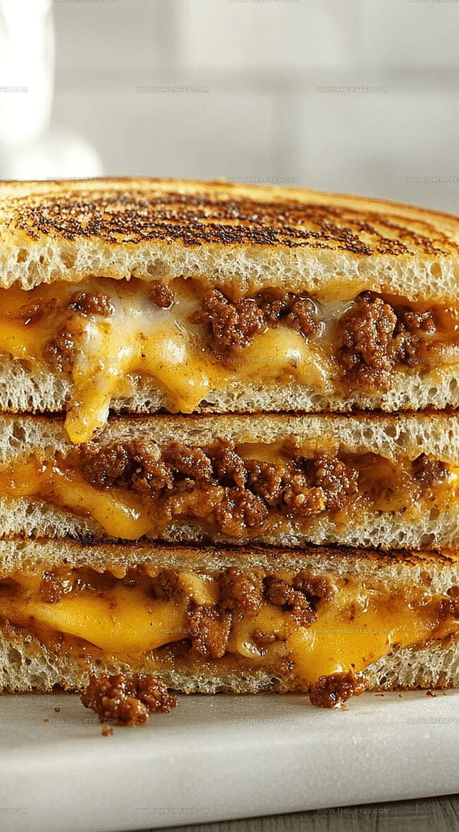 Hearty ground beef grilled cheese sandwich combines savory meat with melted cheese between crispy bread slices. Comfort food perfection awaits those seeking a satisfying meal that delivers rich flavors and simple culinary joy.