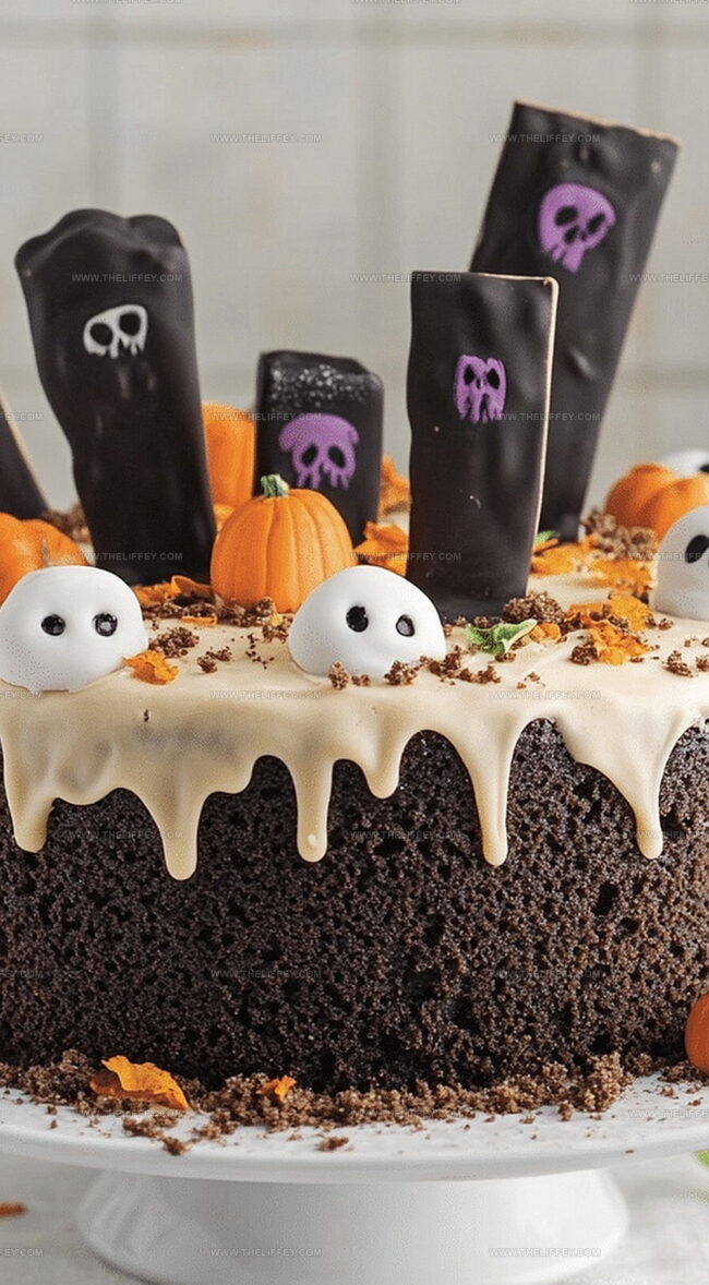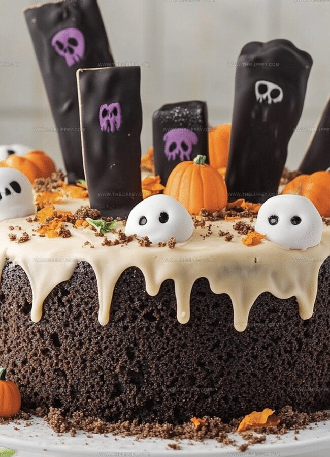 Spooky Halloween graveyard chocolate poke cake delivers a haunting dessert experience for seasonal celebrations. Creamy chocolate layers adorned with cookie tombstones and gummy worm decorations create a playful horror-themed treat that delights party guests.