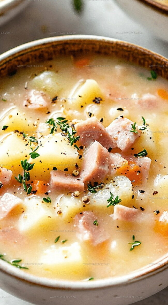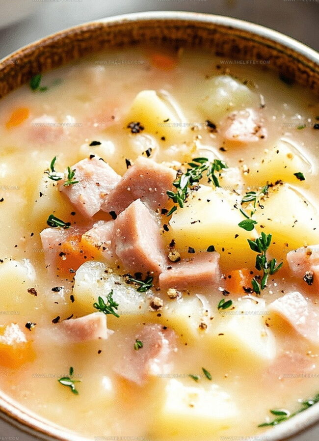 Comfort arrives in a steaming bowl of hearty ham and potato soup that promises warmth and satisfaction.