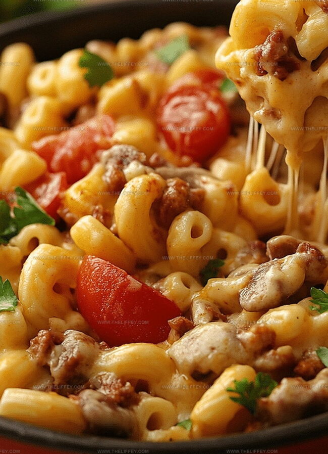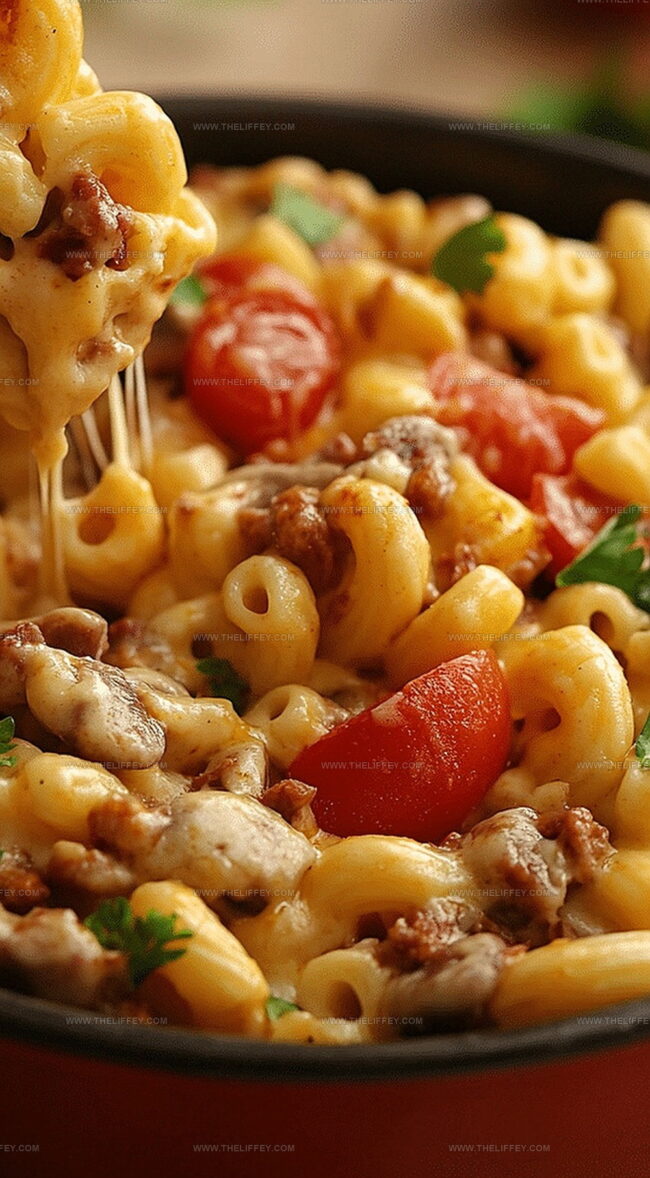 - Pour cheese sauce over cooked pasta, gently folding to ensure even coating. Add seasoned beef mixture and stir until ingredients are thoroughly combined and heated through.
