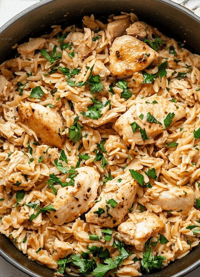 Tender chicken pieces nestle among soft orzo, absorbing rich seasonings with each gentle stir.