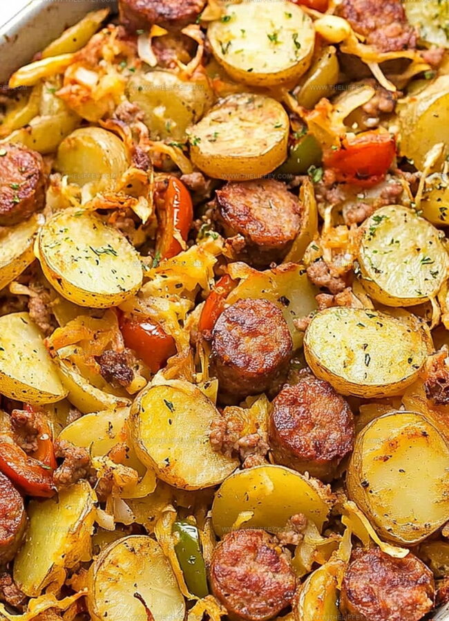 - Verify the sausage is thoroughly cooked and potatoes have achieved a golden, crispy exterior with tender interior.