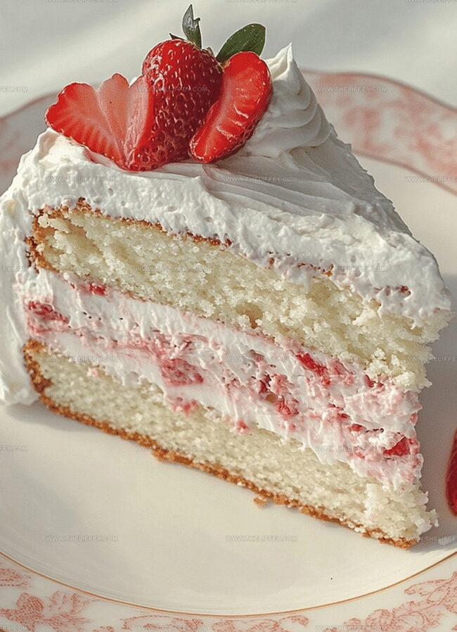 Delicate strawberry swirls peek through pristine white frosting like unexpected bursts of summer sunshine.