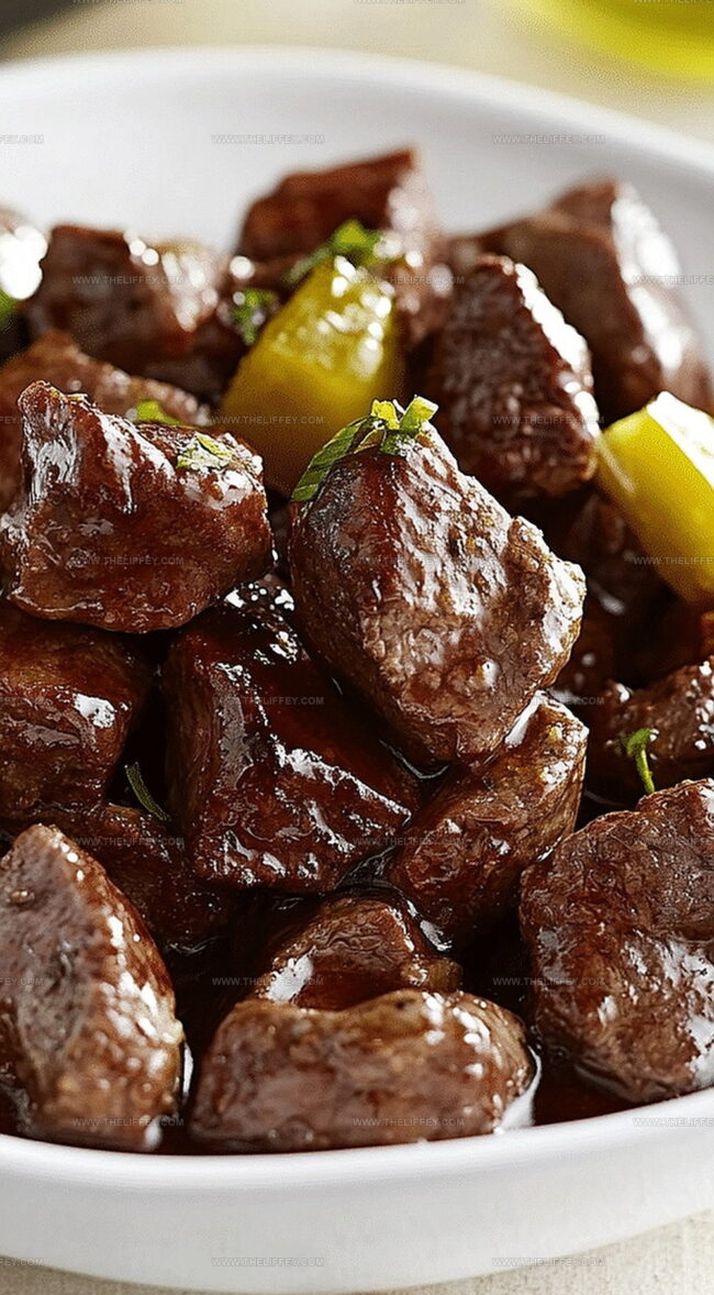 Tender beef chunks marinate in a rich, tangy sauce that melts in your mouth.