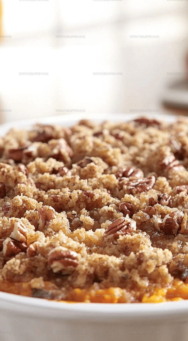 - Generously scatter the pecan crumble mixture across the entire surface of the sweet potato base, ensuring complete coverage.